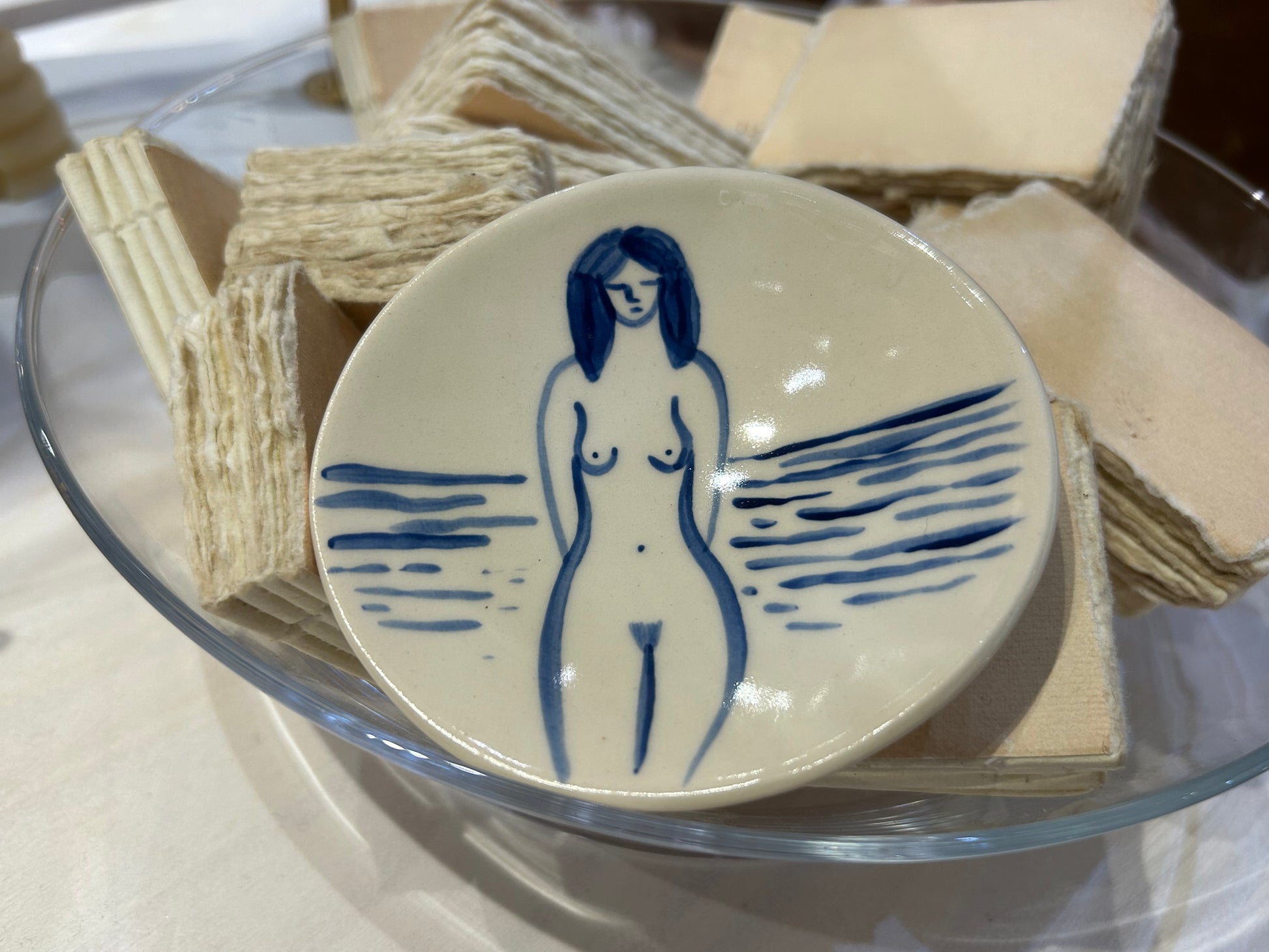 Trinket dish painted with blue underglaze on an ivory white clay. Inspired by Matisse, each design is hand-painted and varies slightly.