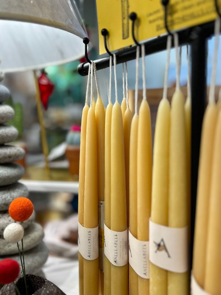 Two 100% beeswax taper candles. Each candle has been hand-dipped and measures approximately 11.5 inches.