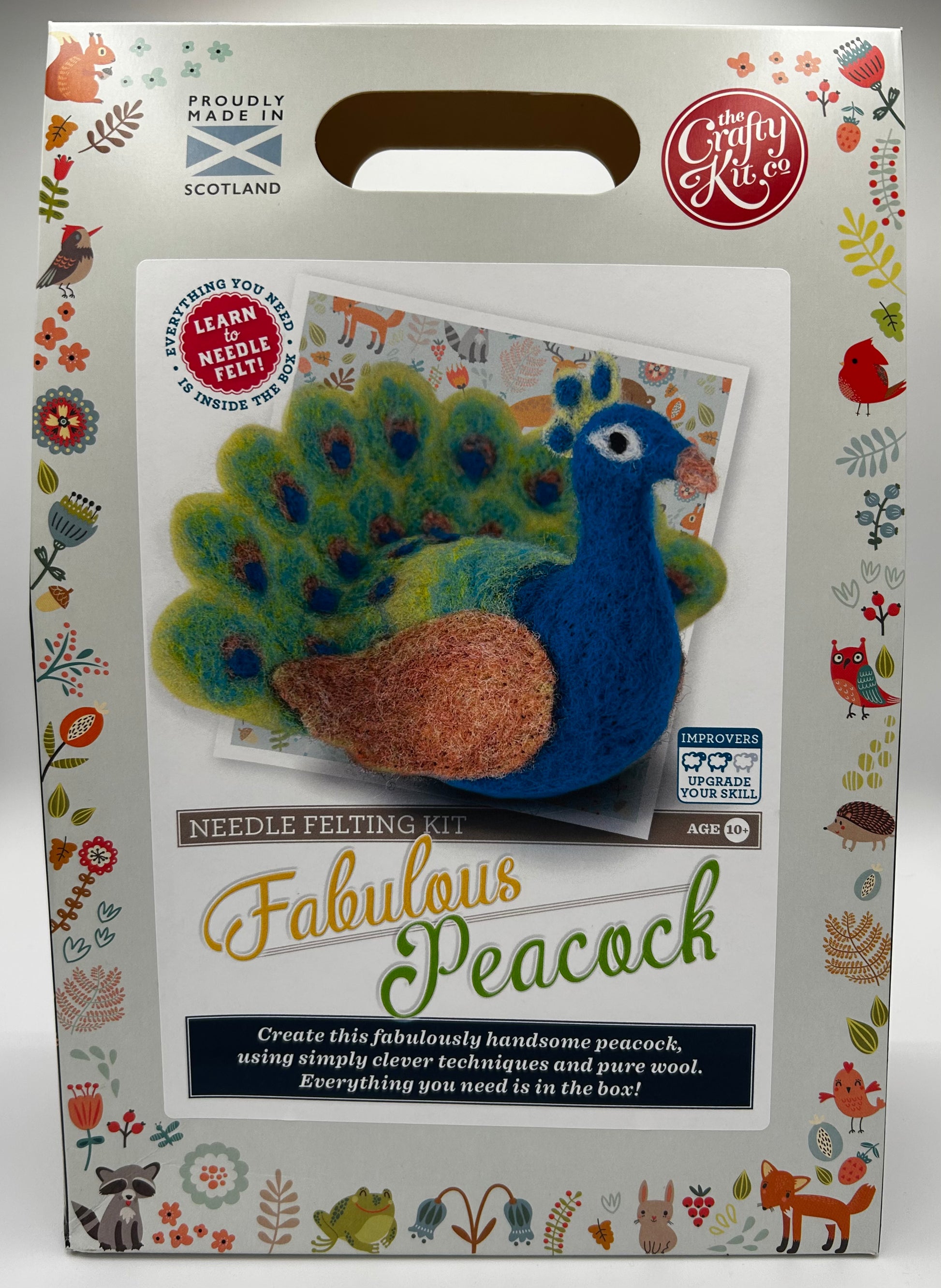 Needle felting kit containing everything you need to make a handsome felted peacock! This project is rated slightly more difficult for those looking to improve their felting skills. Suitable for ages 10 and up.