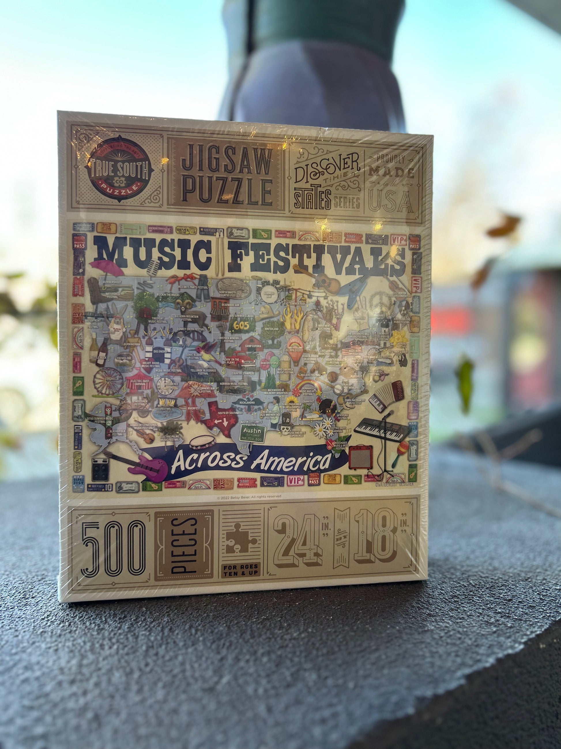 A colorful homage to music festivals - the fields parks and amphitheaters where music lovers gather framed by a ticket stub border - created by designer Betsy Beier. 500 piece puzzle measuring 24" x 18".
