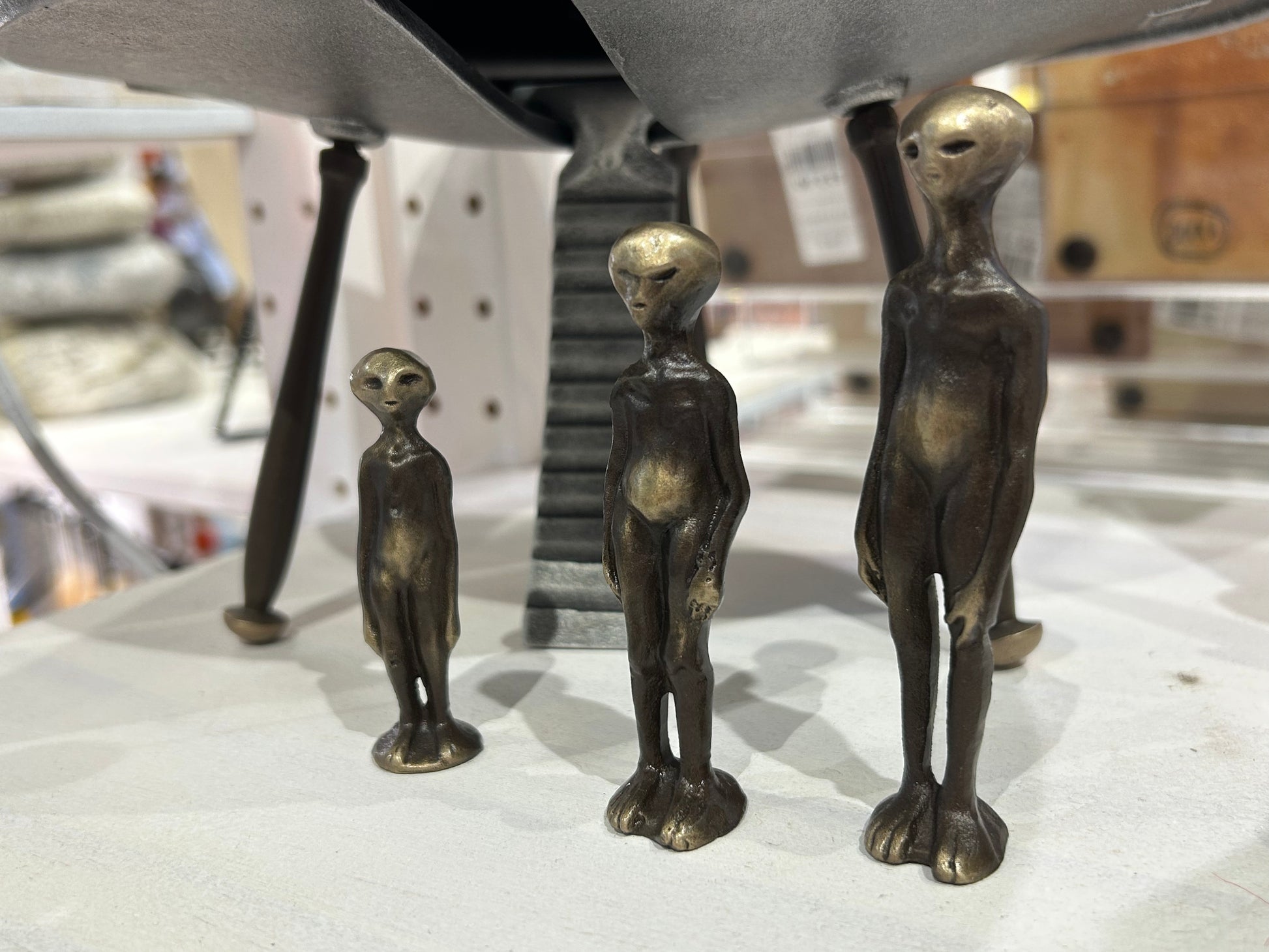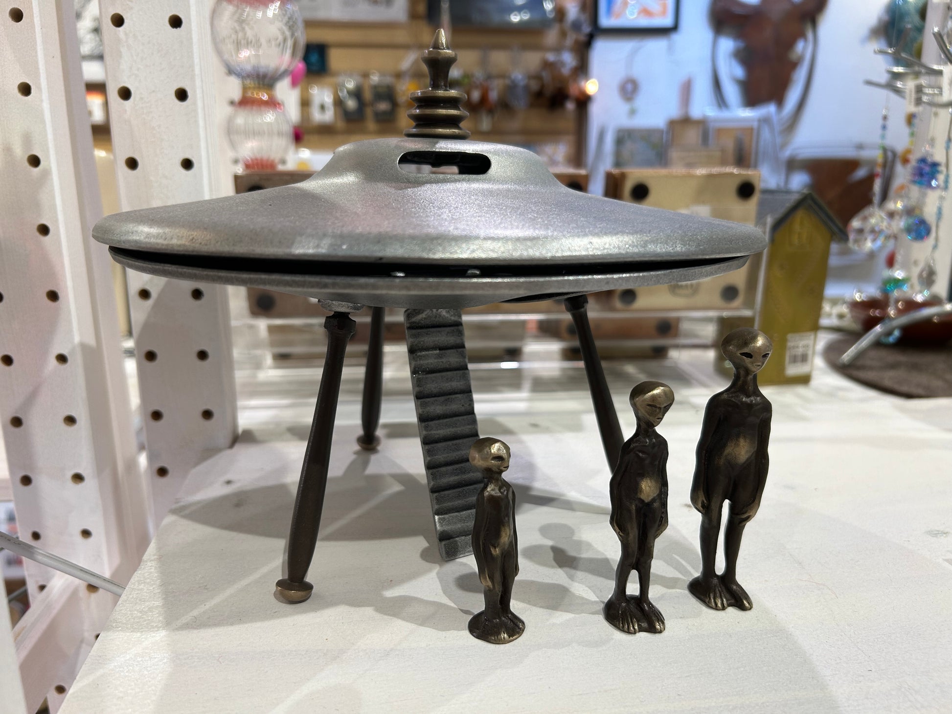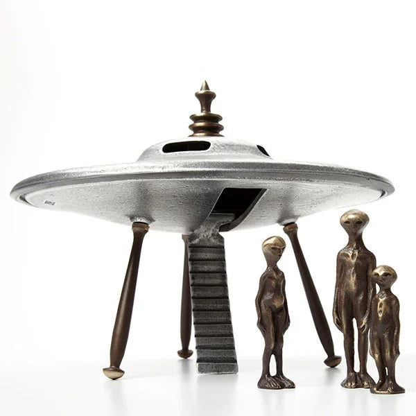 Cast from bronze and aluminum, this family of aliens is ready to visit a planet near you. The top half of the saucer lifts up to reveal the interior of the ship, and the boarding ladder can be left extended or fold up to the ship to keep the aliens inside secure. From largest to smallest, the aliens measure 3.75", 3.25", and 2.5" tall.