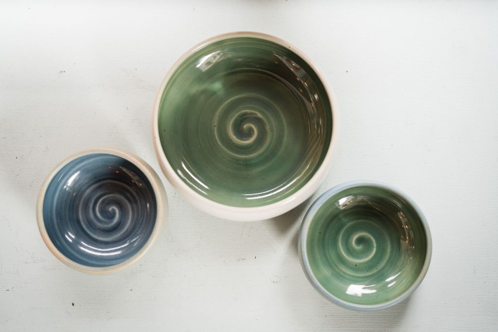 Porcelain wheel thrown pottery from Utah artist, Amanda Green. This bowl features a dark gray exterior with mossy green interior. Microwave and dishwasher safe.